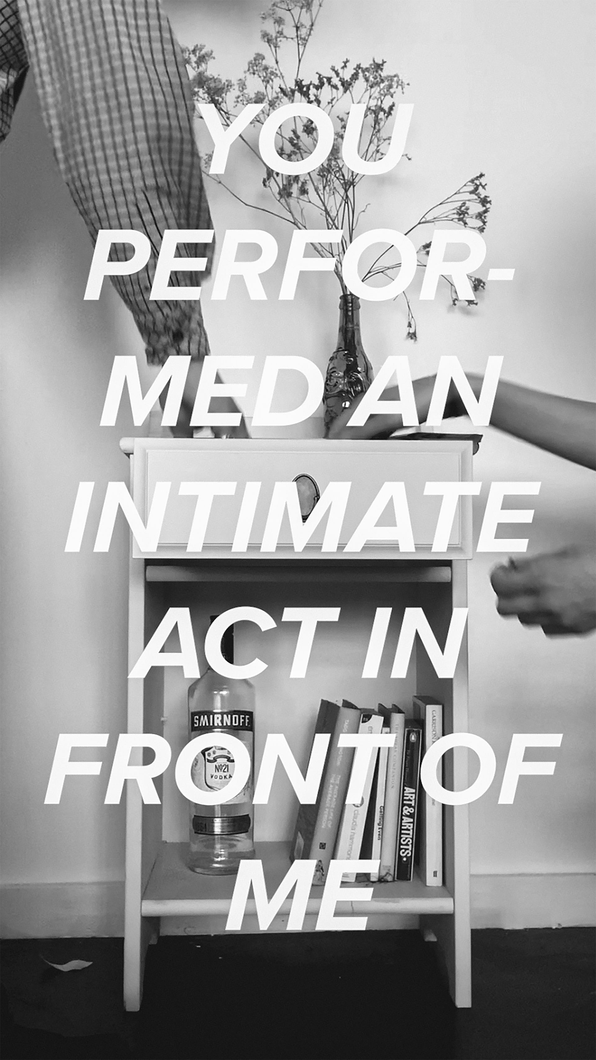 I talked to people cross-legged on their living room sofas, in empty art studios, sweaty on bedsheets, while they were in relationships, just after they'd had their heart broken. I try to experience their feelings alongside them, to understand their words and read into the objects they keep in their nightstands; things that are close in intimate moments. I want to know how they feel about casual sex. How do they feel about sharing comfort with someone they barely know or at least have promised no loyalty to? After conversations in pubs with friends, I realised a lot of people didn't really know how they felt about hooking up. Some were traumatised but felt uncomfortable sharing due to fear of backlash whereas others enjoyed it and just assumed everyone felt the same, therefore never feeling the need to discuss it. This is a static support group with the aim of allowing you to either come to terms with your own experiences or to better understand those around you. My publication features ten interviews with young adults living in London who have all participated in hookup culture. Their stories are varied but are honest accounts of how casual sex in our current culture has affected them. Afterwards I realised that some of the interviews strangely fit together. Certain things were recurrently talked about such as earrings or water, and others seemed to directly respond to each other, including two people who both said they felt disgusted by themselves. I combined quotes from various interviews, slightly adjusting them and turning them into a dialogue between a man and woman. The film that resulted from these is a hypothetical conversation between two people who have shagged.