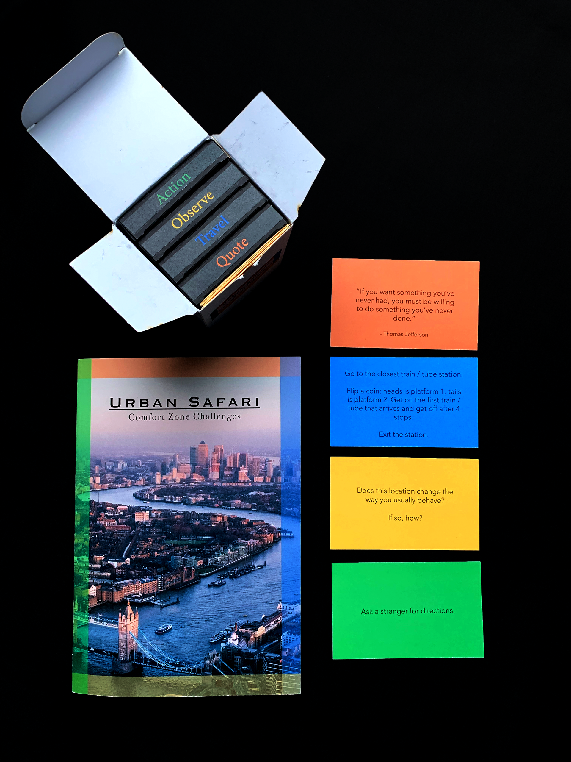 accompany this text. The journal is designed to gradually ease the user into the practice of leaving their comfort zone, while the cards help the user leave their comfort zone in a fun and exciting way. They both take the user on an urban safari, an adventure in the city, a journey of growth, development, self-discovery and self-actualisation.